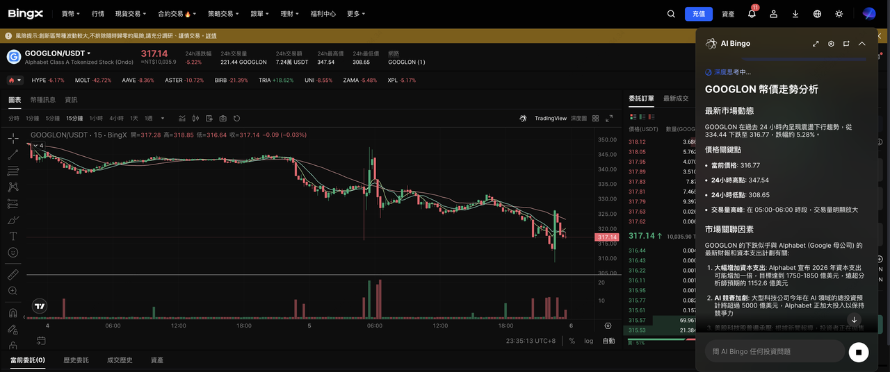 在實務操作上,使用者可依市場狀況,於 BingX 平台內在現貨與永續合約之間進行調整,例如以代幣化美股現貨作為核心配置,搭配永續合約進行短期避險或策略性操作。由於所有部位皆集中於同一帳戶中,無需在不同平台或系統間切換,使代幣化美股能更自然地融入整體加密資產管理流程,而非成為獨立、割裂的投資標的。