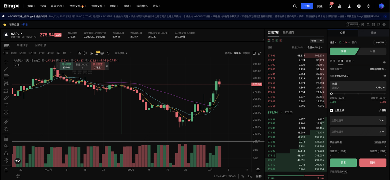蘋果 (Apple) 等,皆可直接以 USDT 建立部位。搭配對繁中用戶相對友善的介面設計,以及具競爭力的現貨手續費結構(掛單 0.02%、吃單 0.05%),BingX 在代幣化美股的實際操作上,更接近一個可長期使用的整合式入口,而非僅供嘗試的實驗性產品。對使用者而言,這樣的設計意味著美股曝險可以被納入既有的加密資產帳戶中進行統一管理,並依個人交易節奏,在現貨與相關衍生性商品之間進行調整,而不必額外切換不同的交易系統或帳戶架構。