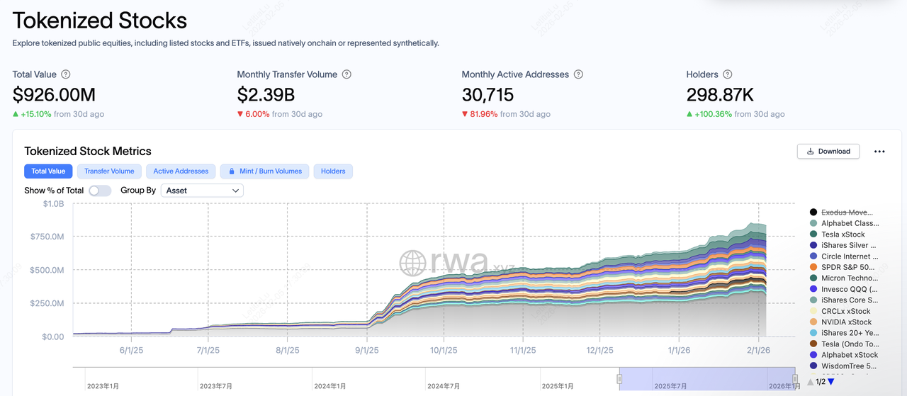 代幣化股票總市值已接近 9.26 億美元,月轉帳交易量約 23.9 億美元,活躍錢包地址數約 3 萬個,累計持有錢包數接近 30 萬個。相較 2024 年以前幾乎可忽略的規模,代幣化美股在 2025 年下半年至 2026 年初出現明顯加速成長。