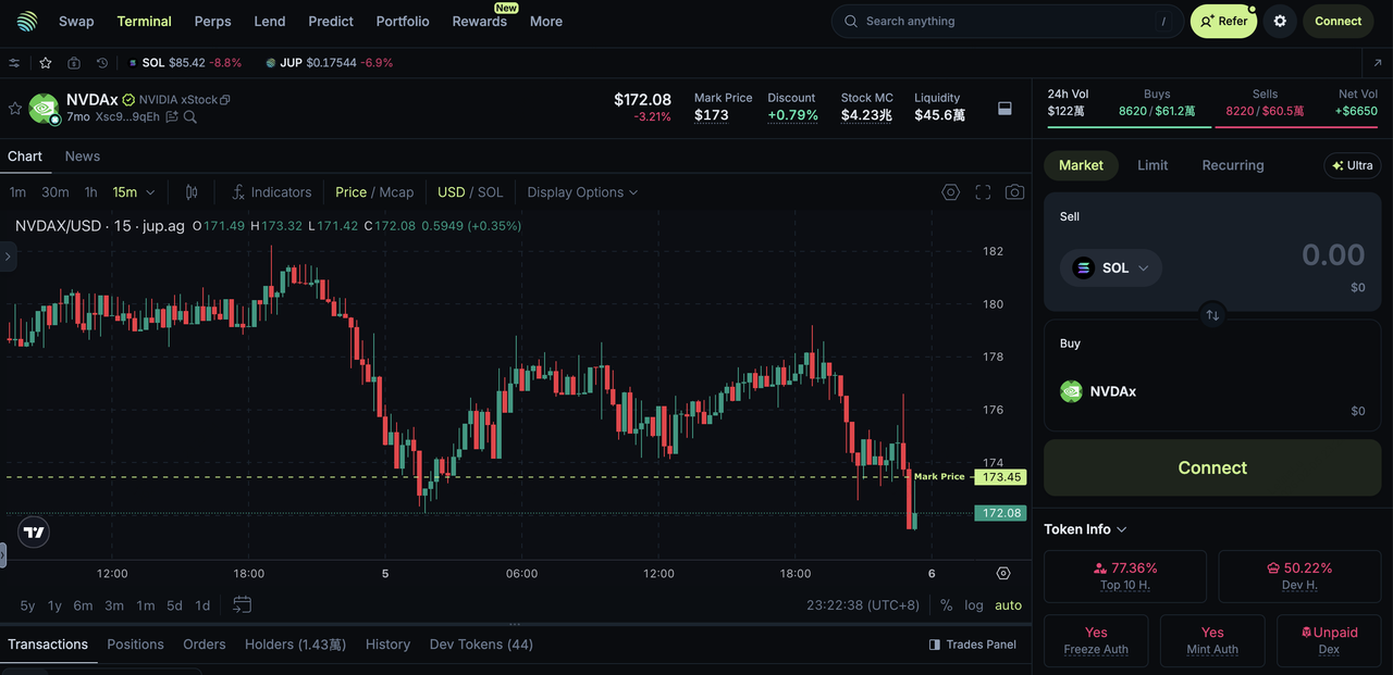 AMM 流動性來源,Jupiter 能在全程鏈上結算的前提下,提供相對具競爭力的價格效率,成為 Solana 生態中代幣化美股的重要交易入口。