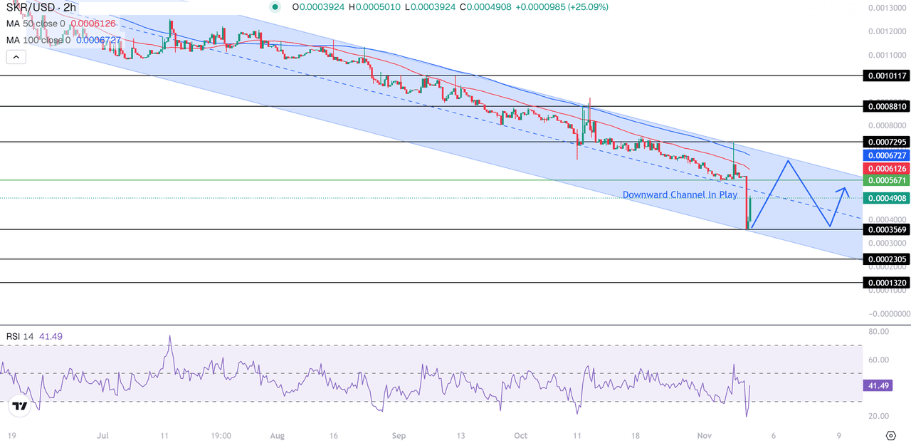 Una configuración de compra (long) constructiva aparece si SRK se mantiene por encima de $0.0004908 y cierra decisivamente por encima del pivote de la mitad del canal, apuntando a $0.0005671 y $0.0007295. La invalidación se sitúa por debajo de $0.0003569.