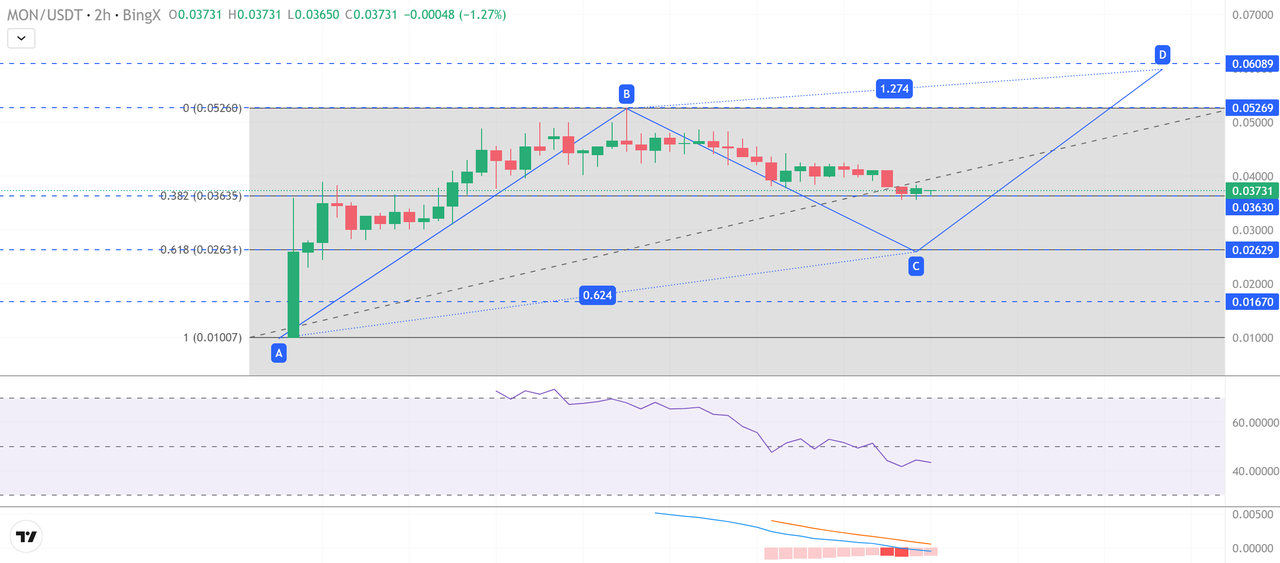 RSI está formando una divergencia alcista, a menudo un precursor de una reversión de la pata CD en estructuras armónicas. Mientras MON se mantenga por encima de $0.0167, el