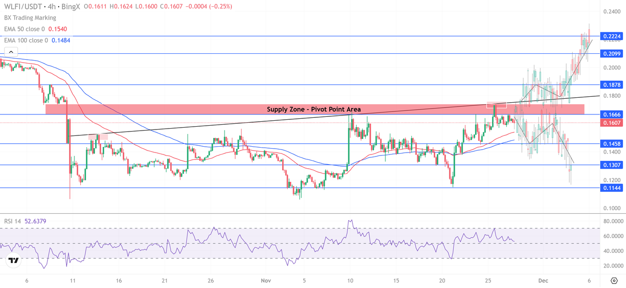 WLFI/USDT en el gráfico de 4 horas (4H) en BingX está operando justo por debajo del
