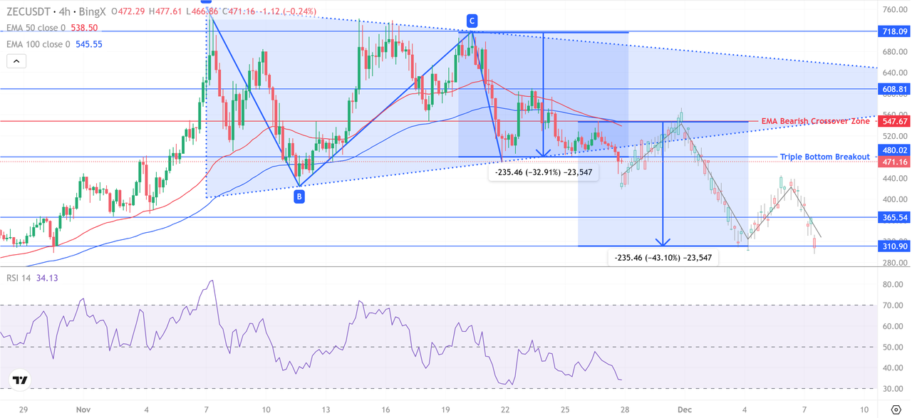 ZEC/USDT en el gráfico de 4 horas (4H) de BingX está retrocediendo después de fallar en sostener el impulso por encima de la línea de cuello del triple fondo de $480. El precio permanece limitado por el canal descendente a largo plazo que se extiende desde $608–$718, y el mercado continúa operando por debajo tanto de la EMA de 50 ($538) como de la EMA de 100 ($545), una zona que ahora actúa como una barrera de cruce bajista.