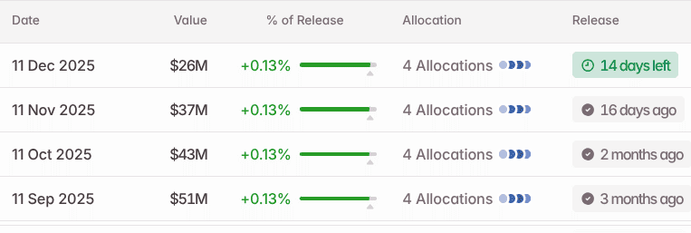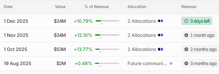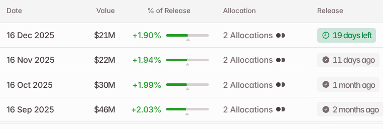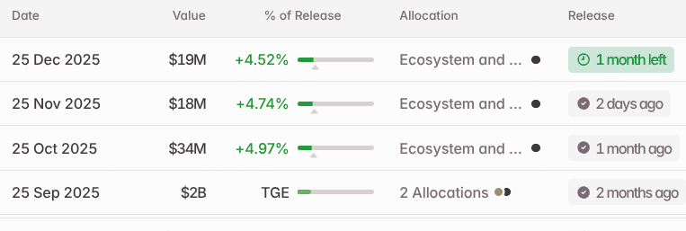 stablecoin tienden a ser altamente sensibles a las emisiones de tokens, lo que significa que desbloqueos de este tamaño pueden influir en las recompensas de staking, la profundidad de liquidez y el comportamiento de holders tempranos.