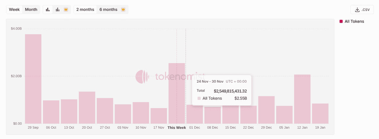 Diciembre de 2025 presenta uno de los clústeres más concentrados de eventos de desbloqueo importantes de este año, con valores de tokens acumulativos en los cientos de millones altos. Estos desbloqueos abarcan blockchains de capa uno, protocolos de infraestructura y ecosistemas emergentes, creando un paisaje diverso de eventos potenciales de suministro. Muchos de los proyectos más grandes que se desbloquean este mes representan redes con volumen de trading significativo, lo que significa que algunos desbloqueos pueden ser absorbidos suavemente.