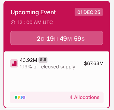 • Número de Tokens a Desbloquearse: Aproximadamente 64.19 millones de SUI (alrededor del 2.26% de su suministro circulante)