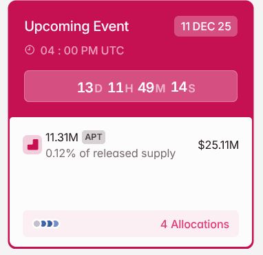 Aptos desbloqueará alrededor de 11.31 millones de tokens a mediados de diciembre. Esta liberación se ajusta dentro de su estructura de emisión lineal regular, lo que puede ayudar al mercado a ver el evento como predecible en lugar de disruptivo. Aun así, los receptores de grandes asignaciones aún podrían influir en la acción del precio a corto plazo si eligen mover tokens a exchanges. Aptos continúa expandiendo su ecosistema de desarrolladores a través de nuevas herramientas, integraciones y aplicaciones, lo que puede ayudar a respaldar la demanda alrededor del desbloqueo.