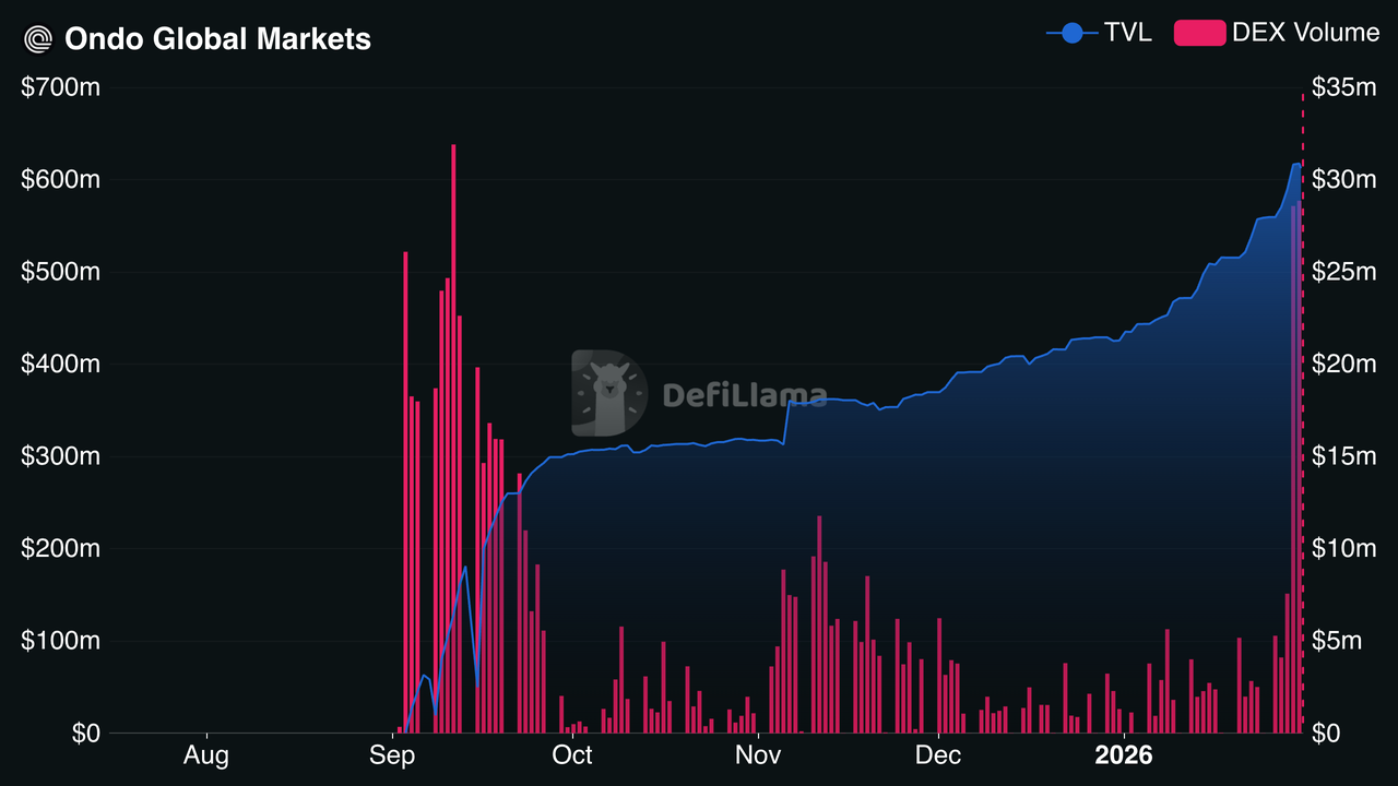 TVL y volumen de Ondo Global Market | Fuente: DefiLlama