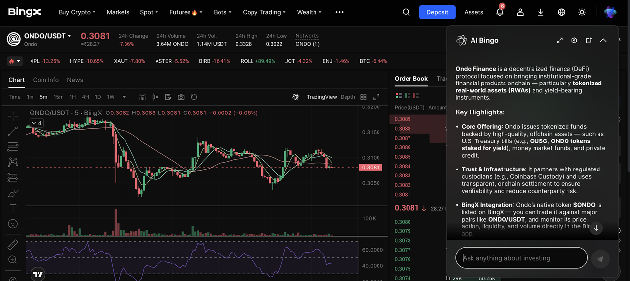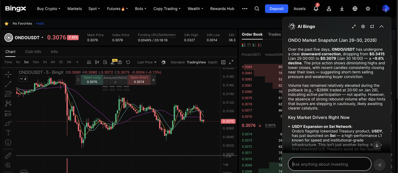 Contrato perpetuo ONDO/USDT en el mercado de futuros potenciado por BingX AI