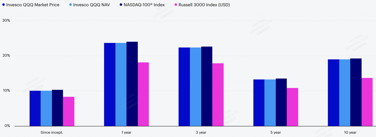 Rendements annualisés du QQQ vs Nasdaq 100 et Russell 3000 | Source : Invesco