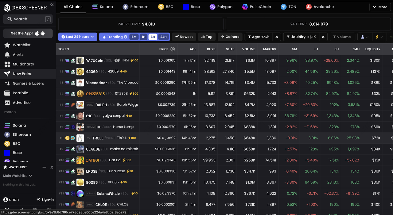 BNB Chain, Dex Screener dessert désormais plus de 5 millions d'utilisateurs mensuels uniques qui dépendent de ses graphiques avancés intégrés à TradingView, de ses mises à jour de données instantanées et de ses outils intuitifs.