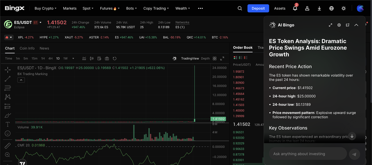 Powered by BingX AI insights, you can trade ES and other modular ecosystem tokens efficiently using real-time market signals.
