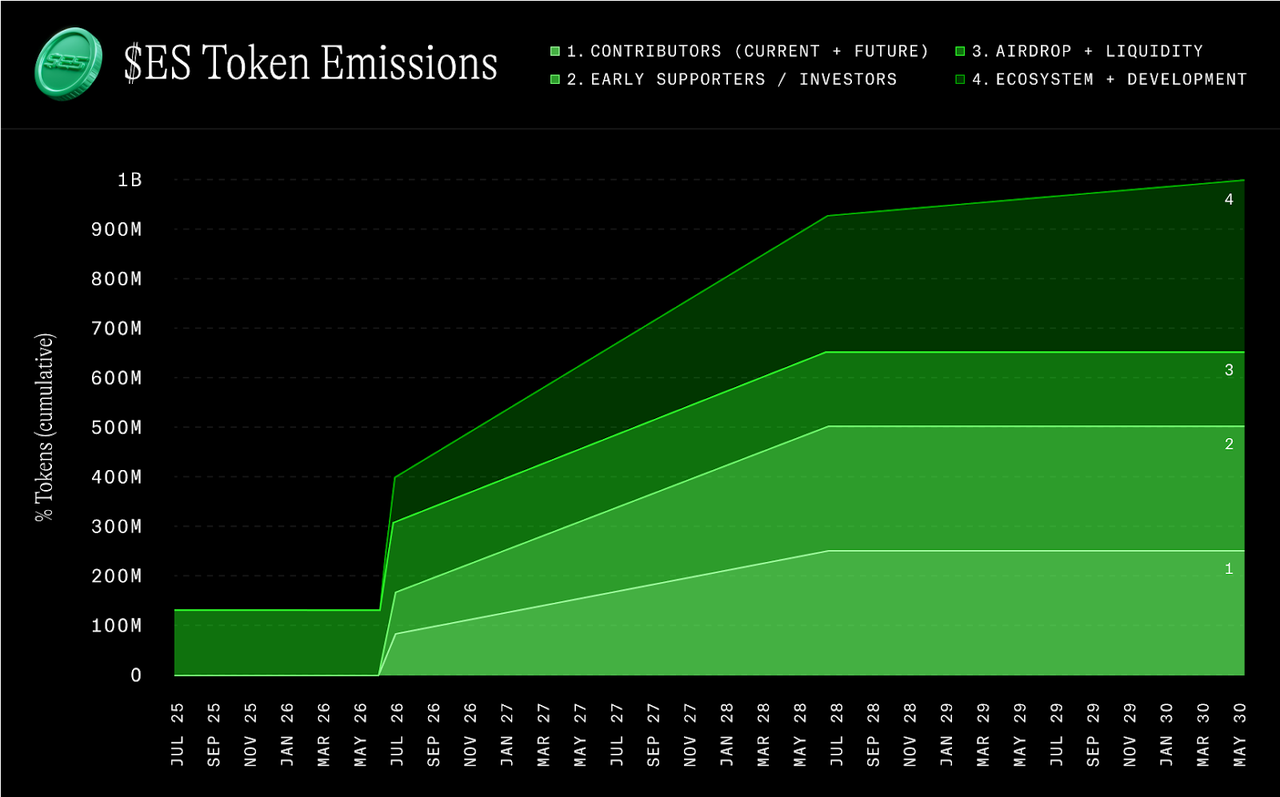 • Airdrop and Liquidity: 100% of the initial 150 million ES was unlocked at the Token Generation Event (TGE) on July 16, 2025, to bootstrap immediate network activity and trading.