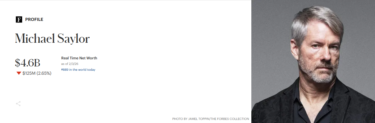 Début février 2026, la valeur nette de Michael Saylor est estimée à environ 4,7 milliards de dollars, selon les données en temps réel de Forbes. Ce chiffre représente une évaluation à haute sensibilité qui fonctionne comme une approximation en direct de la performance du marché des actifs numériques au sens large.