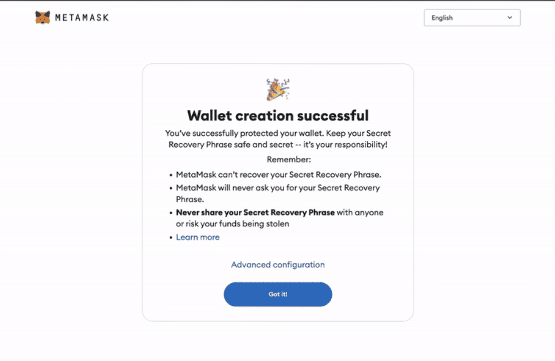 Étape 3 : Après avoir ajouté l'extension MetaMask, MetaMask s'ouvrira automatiquement. Configurez votre phrase de sauvegarde secrète qui est le seul moyen de récupérer votre portefeuille MetaMask si vous oubliez votre mot de passe, perdez l'accès à votre appareil ou voulez vous connecter depuis un autre appareil. Pour terminer la configuration, confirmez la phrase dans l'ordre exact fourni, puis cliquez sur « Terminé » pour finir. Vous pouvez aussi vous assurer qu'elle est facilement accessible dans votre barre d'outils en cliquant sur l'icône puzzle en haut à droite de l'écran et en appuyant sur l'icône d'épingle. Épinglez MetaMask pour un accès facile depuis la barre d'outils de votre navigateur.