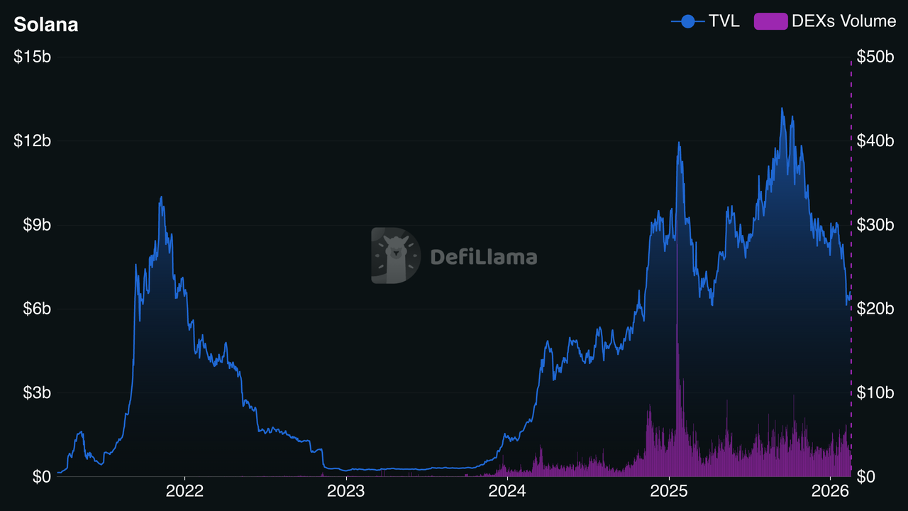 TVL DeFi Solana dan volume DEX | Sumber: DefiLlama