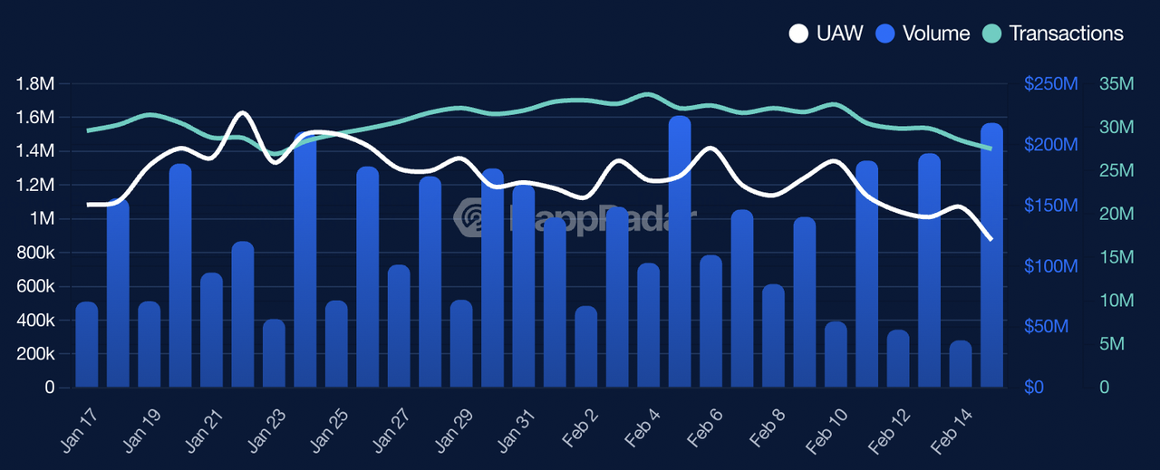 UAW, volume, dan transaksi Solana dalam 30 hari terakhir | Sumber: DappRadar