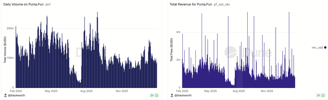 Volume harian dan total pendapatan di Pump.fun | Sumber: Dune Analytics