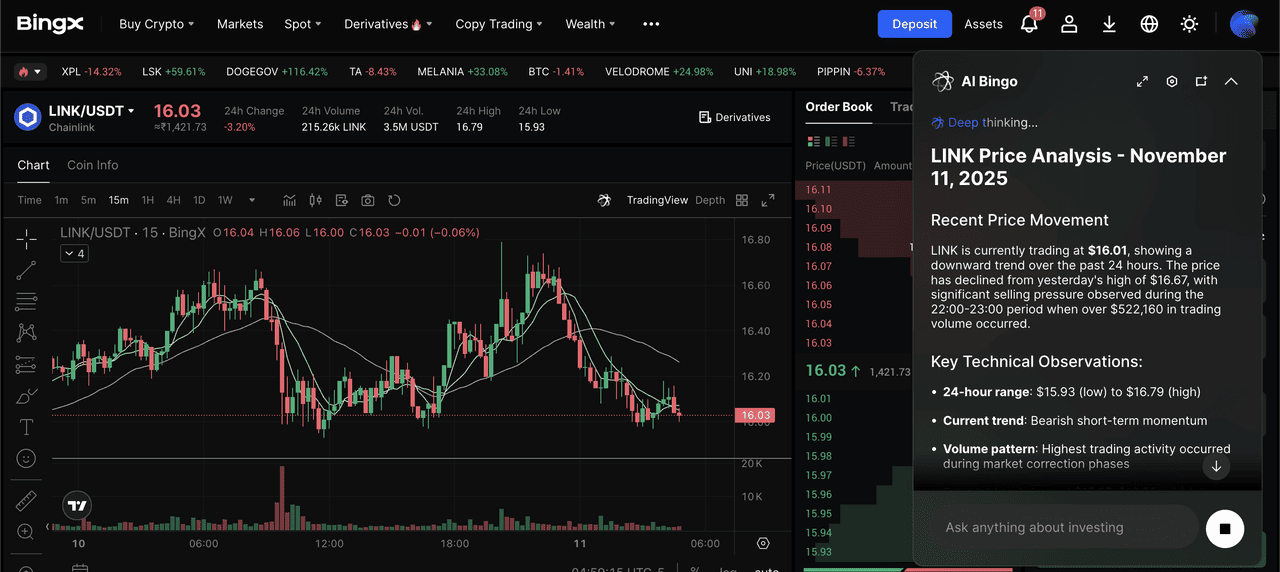 Pasangan perdagangan LINK/USDT di pasar spot yang didukung oleh wawasan AI BingX