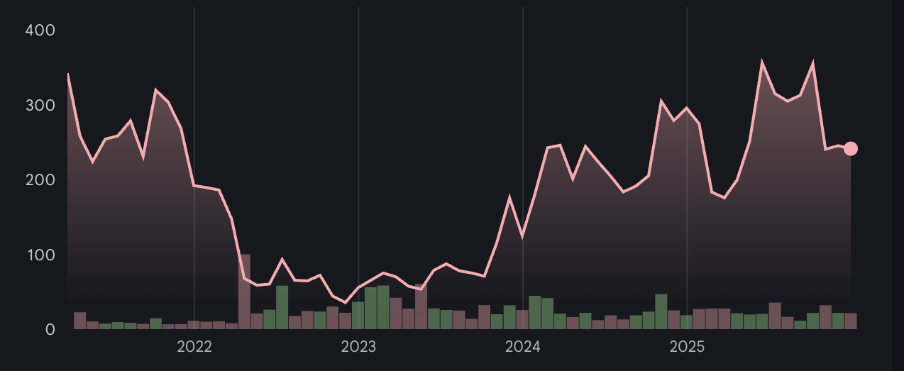 • Mercati ribassisti crypto estesi: Crolli prolungati riducono i volumi di trading retail e istituzionali, comprimono i ricavi di Coinbase e pressano la valutazione di COIN. Durante il ciclo 2022-2023, i volumi spot dell'industria sono caduti del 50-70%, COIN è diminuito oltre l'80% dal picco e il patrimonio netto di Armstrong è caduto di molteplici miliardi di dollari.