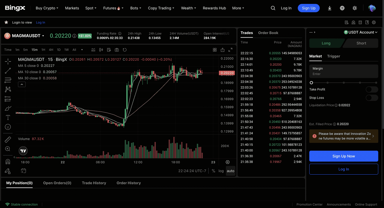 Naviga nella sezione trading Futures e cerca MAGMA o la coppia di trading del contratto perpetuo MAGMA-USDT. Rivedi il prezzo attuale, il grafico e i dati di mercato per prendere decisioni informate.