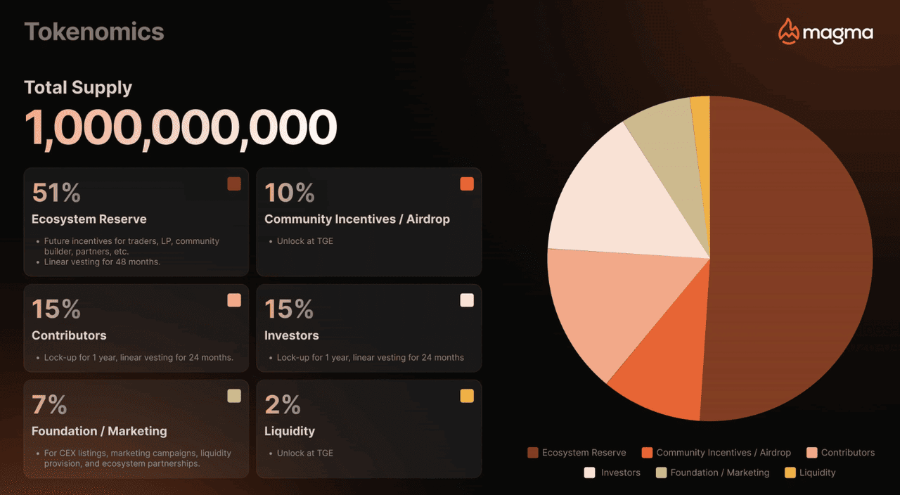 - Fornitura Totale e Massima: Fissata a 1.000.000.000 token MAGMA senza emissioni aggiuntive.