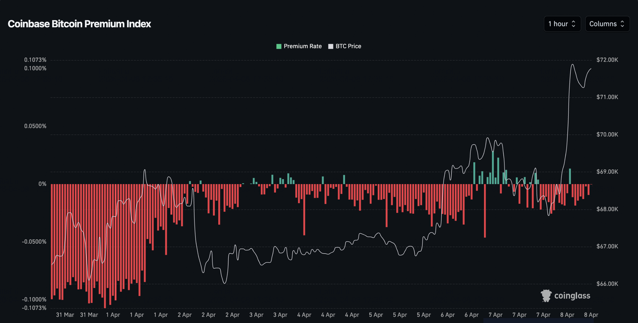 Coinbaseビットコインプレミアム指数は強化の初期兆候を示しており、4月6日から4月8日のセッション間でザラ場読み値がプラスに転じています。15営業日連続でマイナス圏にあった後、この指数はまだ日次終値ベースでプラスに転じていないため、米国の需要は比較的弱いままであることを示しています。しかし、表面下では変化が現れています:指数は3営業日連続(4月6日から4月8日)でプラスプレミアムの期間を記録し、3月19日以来初めてのことです。短時間ではありますが、これらの繰り返されるザラ場プレミアムは注文フローの変化を示唆しており、米国主導の買いが以前の売り圧力を相殺し始めている瞬間があります。