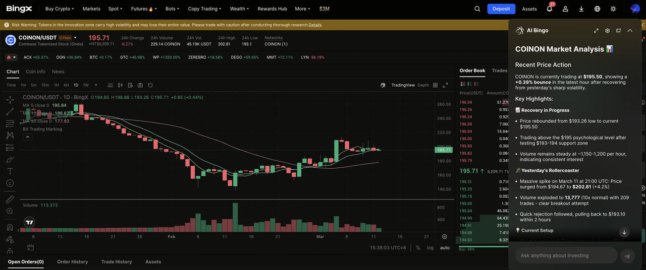 ユーザーはCoinbaseトークン化株式をBingX現物取引でUSDTを使用して取引でき、仮想通貨取引環境内でCOIN価格変動への分割エクスポージャーと継続的なアクセスを可能にします。