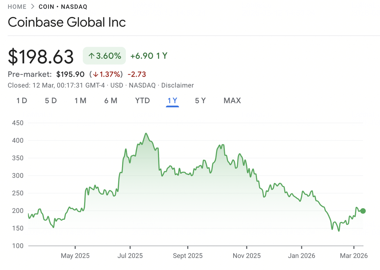 Coinbase Global, Inc.が2021年4月に直接上場でウォール街に登場した際、仮想通貨が主流金融の恒久的な一部となるという最も明確な賭けとして到着しました。COINは380ドル超で始まり、一時的に同社の評価額を確立された金融機関に匹敵するものとしました。2026年3月11日までに、この株式は198ドル付近で取引され、52週間高値の444.64ドルから約55%下落し、2025年第4四半期の決算ミス、小売取引量の軟化、運営コストの上昇に圧迫されました。