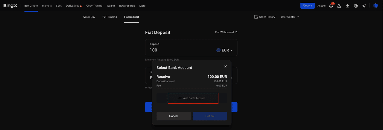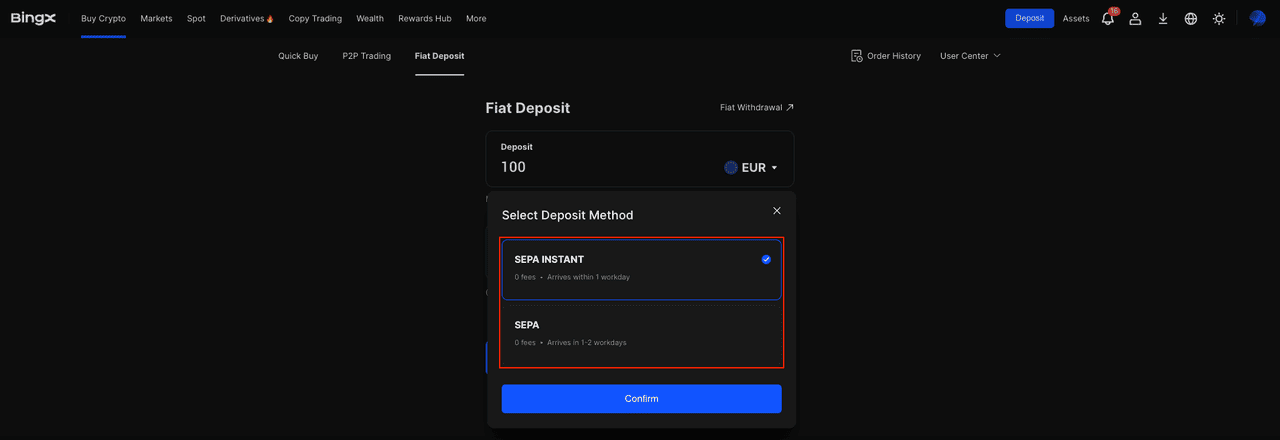 SEPA works well if you want to move larger amounts at fair conditions, especially in EUR. BingX supports Euro deposits via SEPA and SEPA Instant. Once credited, you convert the balance into BTC, ETH or stablecoins like USDT.