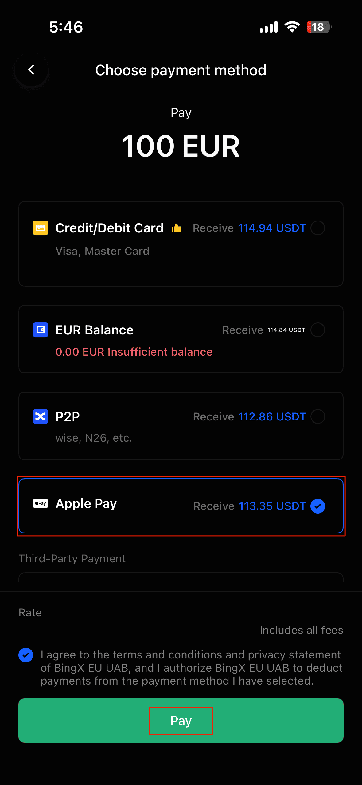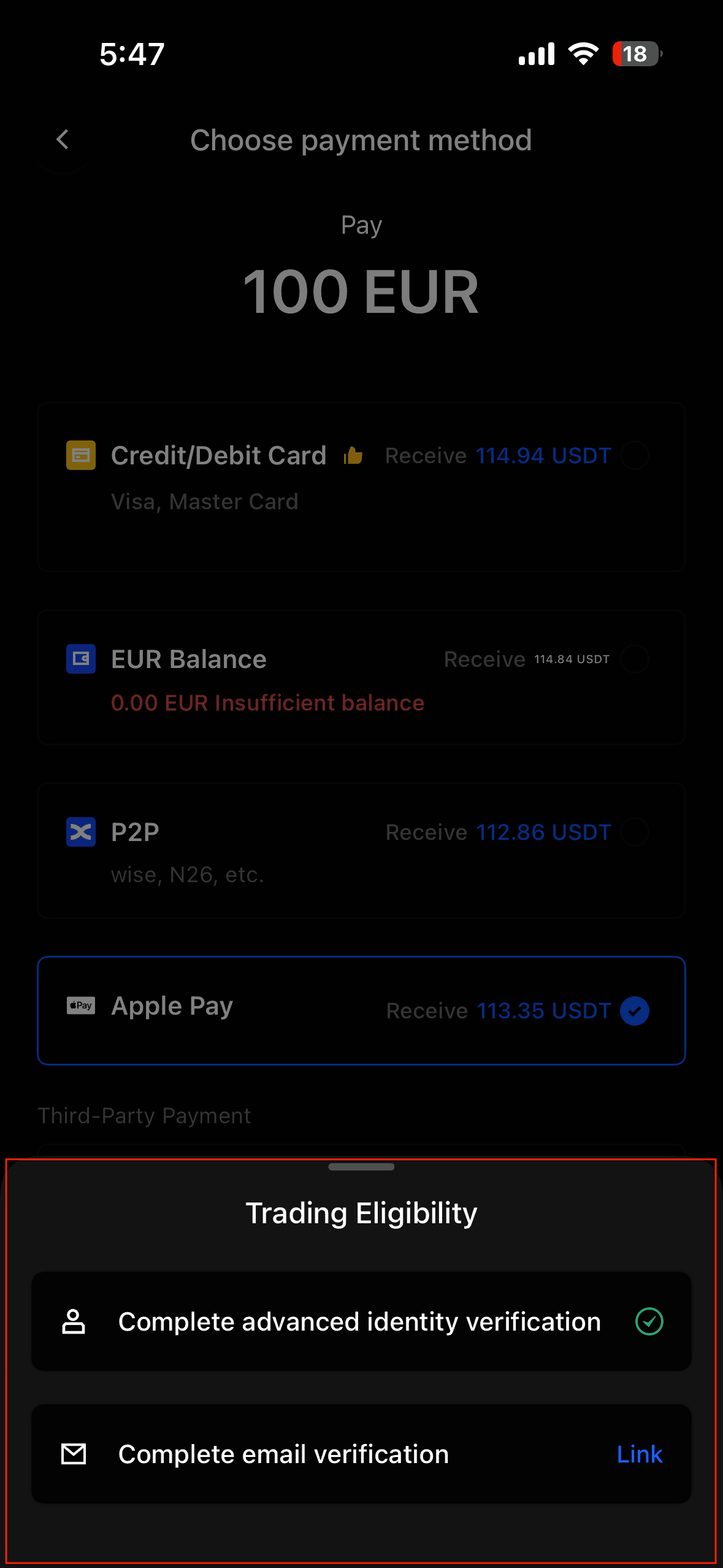 Fees depend on payment method, region and partner service. Always review the order summary with rate, fee and final amount before confirming so you understand your effective costs for trading.