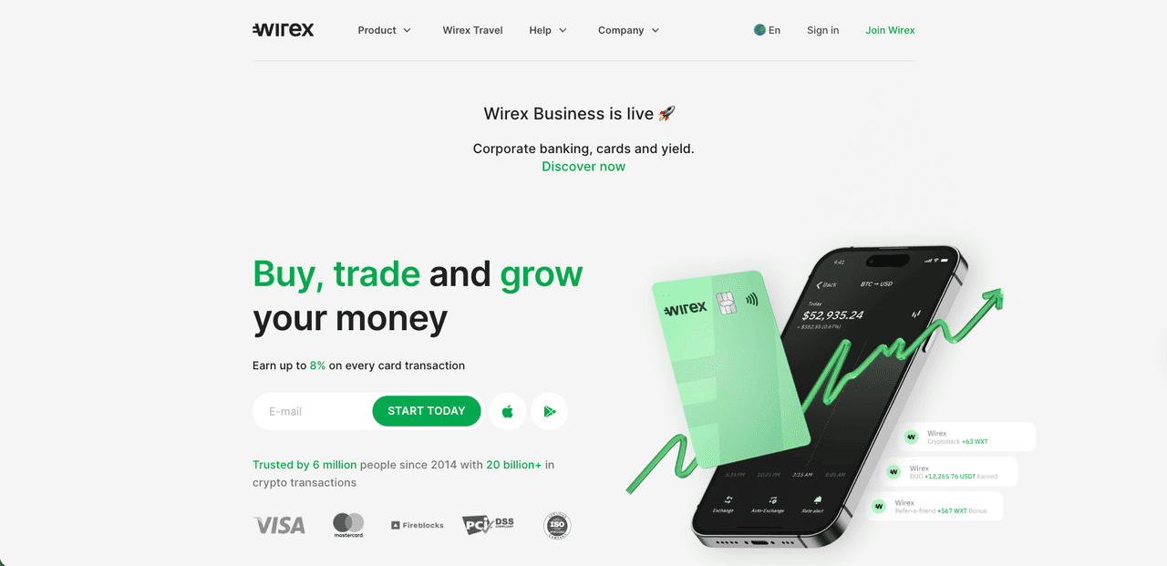 Wirexは自らをWeb3マネーアプリと称し、実際にはVisaとMastercardを中心に構築されたグローバルな暗号資産ネオバンクとして機能します。数十の法定通貨と200以上の暗号資産をサポートし、チェックアウト時に自動で暗号資産から法定通貨への変換が行われるため、残高から直接支払いが可能です。また、WXTトークンでの一桁台のキャッシュバックや、Xアカウントを介した選択された残高での利回りも提供しています。