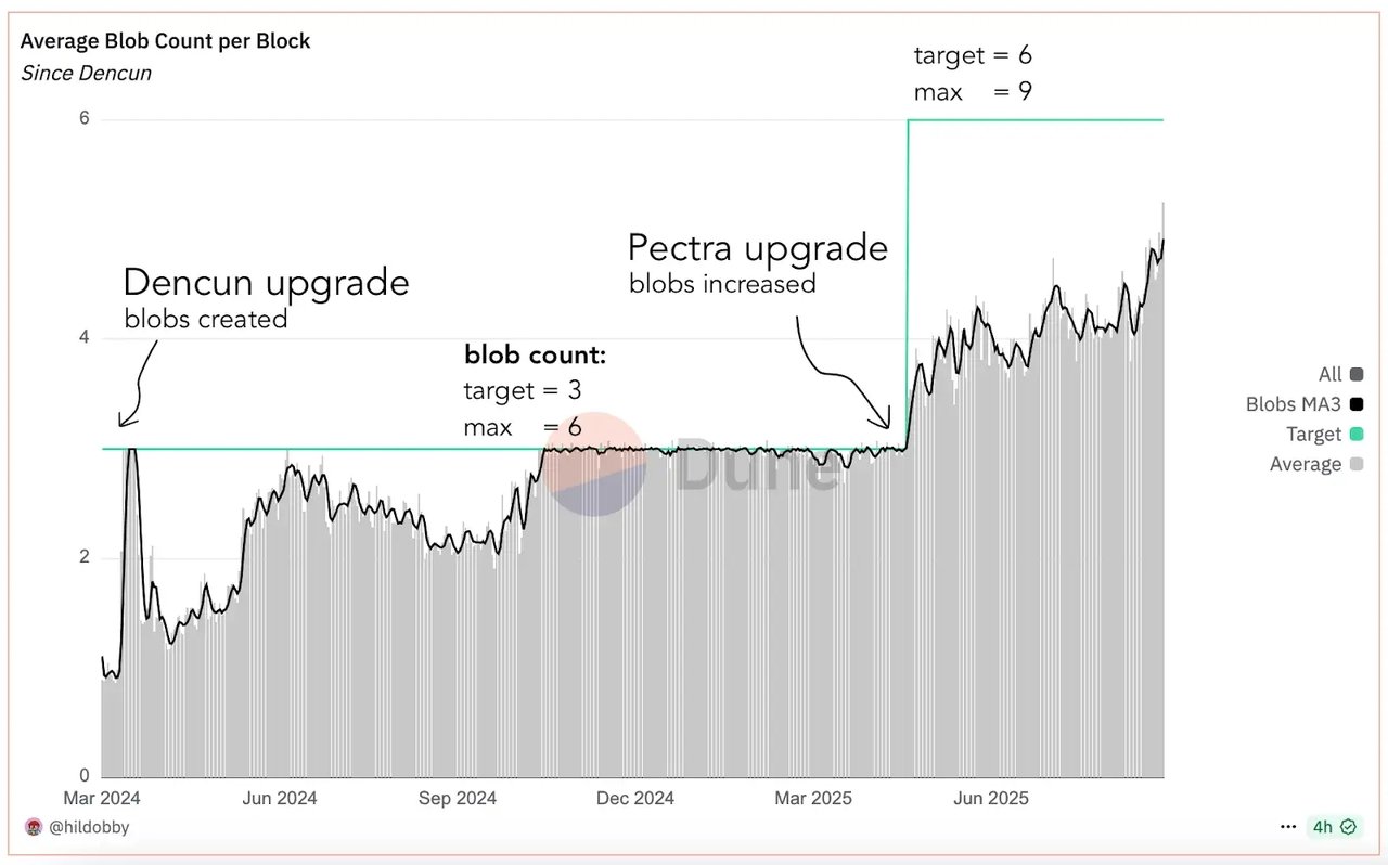 Ethereumネットワークにおけるブロックあたりの平均ブロブ数 | 出典: Ethereum.org