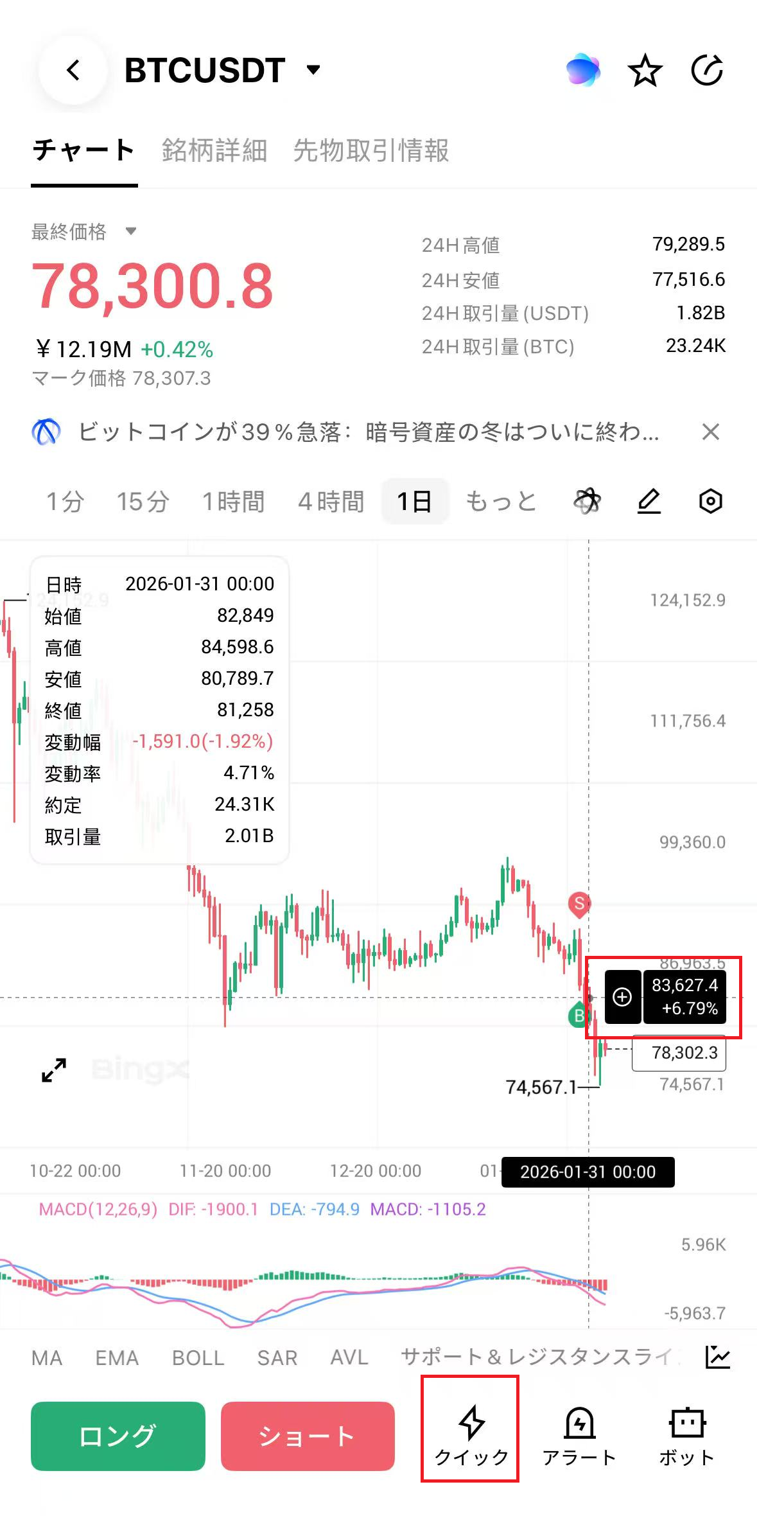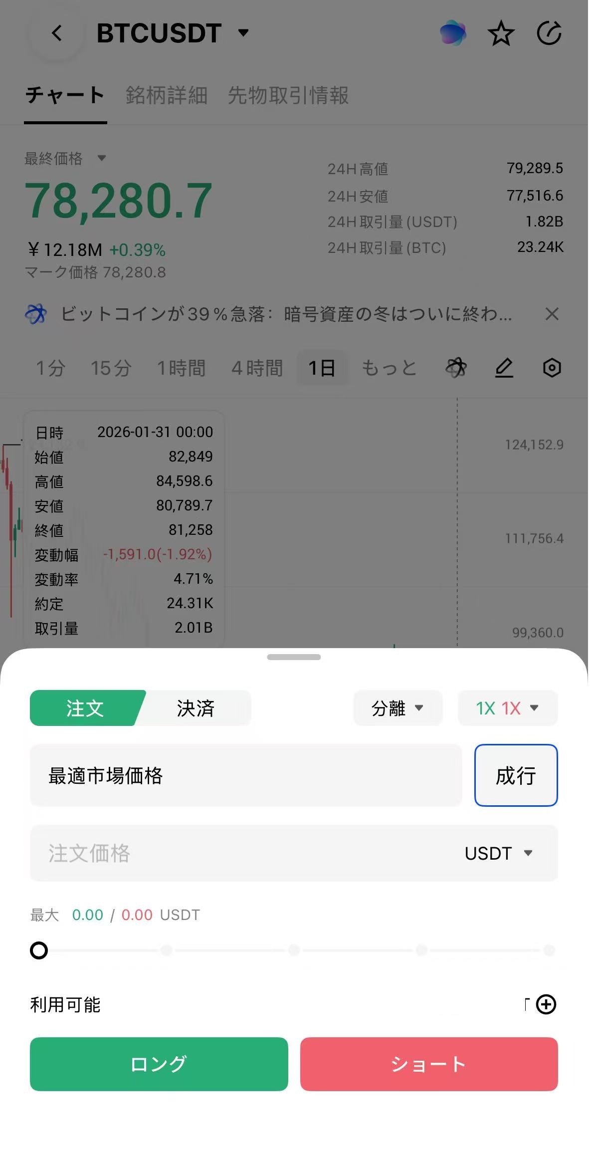 • 「クイック」ボタンをタップすると、デフォルトで市場注文が選択されます。