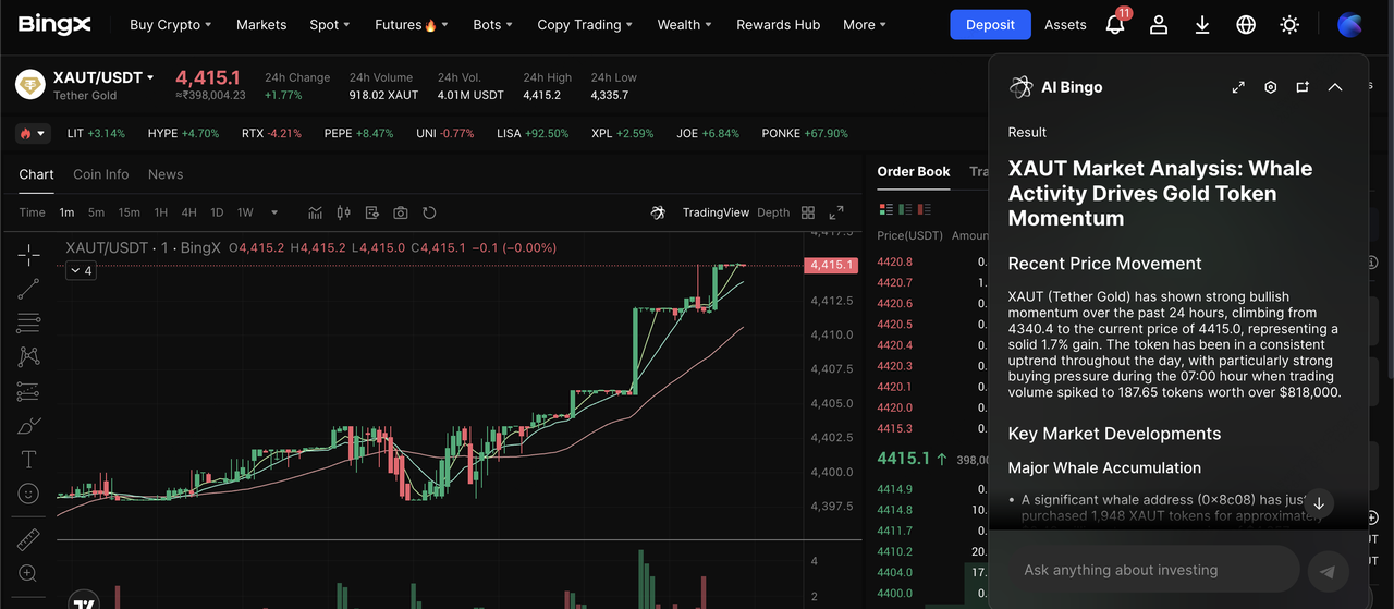 BingX AI, które dostarcza dane rynkowe w czasie rzeczywistym, analizę trendów i wskaźniki ryzyka bezpośrednio w interfejsie handlowym, pomagając traderom identyfikować zmiany momentum, kluczowe poziomy cenowe i niestabilność na rynkach złota.