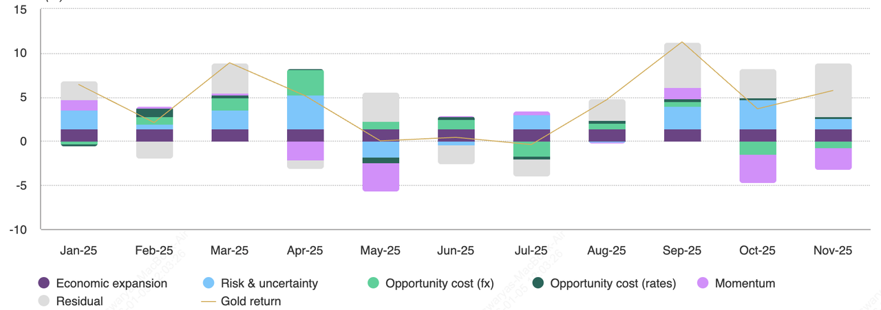 Chociaż złoto wydaje się niedoalokowane na poziomie portfela, krótkoterminowe pozycjonowanie może nadal stać się przepełnione. World Gold Council szacuje, że momentum, pozycjonowanie futures i przepływy ETF przyczyniły się do prawie 9% zwrotu złota w 2025 roku, niezwykle duży udział poza ostrymi okresami kryzysu.