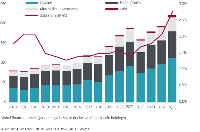 Bank of America poszedł dalej, argumentując, że złoto pozostaje strukturalnie niedoposażone. Jego badania pokazują, że profesjonalni inwestorzy i inwestorzy o wysokiej wartości netto trzymają mniej niż 1% aktywów w złocie, podczas gdy złoto reprezentuje tylko około 4% całkowitej globalnej puli aktywów finansowych. W testowanych stresowo modelach portfela od 2020 roku, BofA sugeruje, że alokacje złota 20% lub więcej mogą być uzasadnione na podstawie dywersyfikacji i zwrotów skorygowanych o ryzyko, znacznie powyżej obecnego pozycjonowania.
