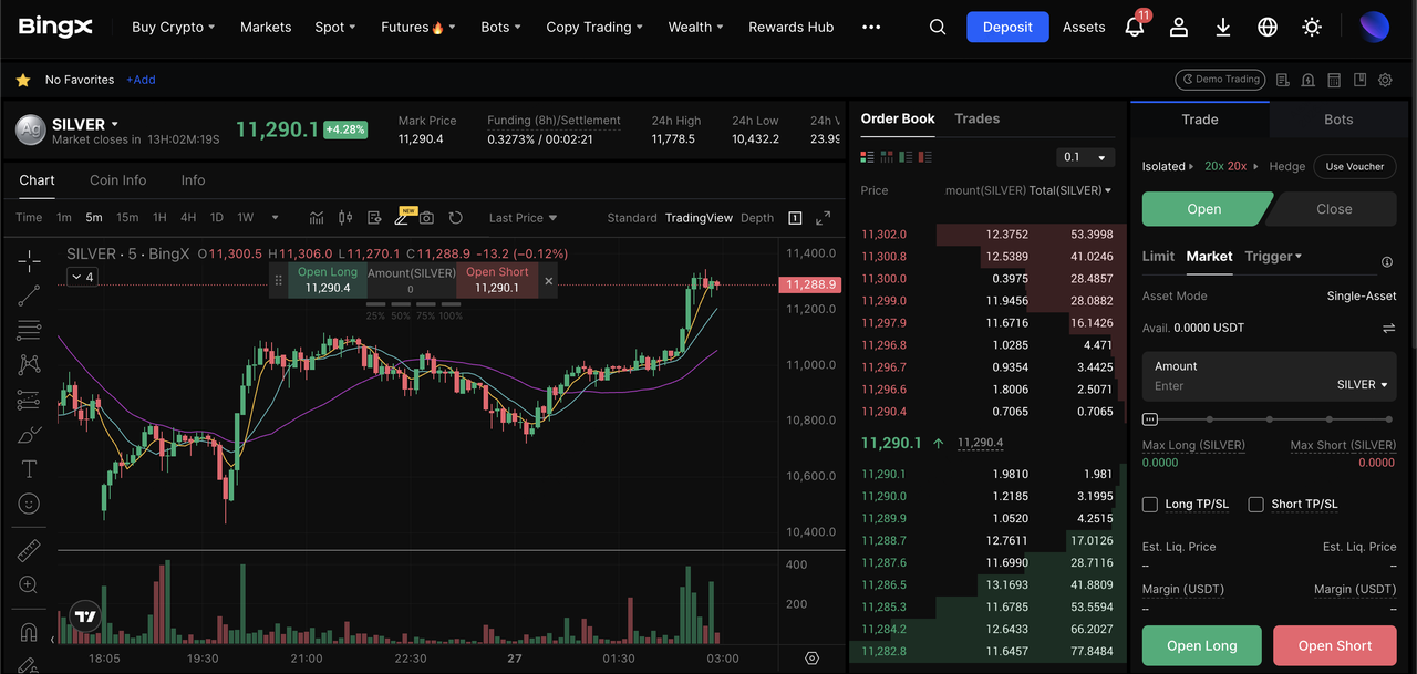 BingX TradFi pozwalają aktywnym traderom na otwieranie pozycji długich lub krótkich i handel zmiennością srebra używając kontraktów rozliczanych w krypto.