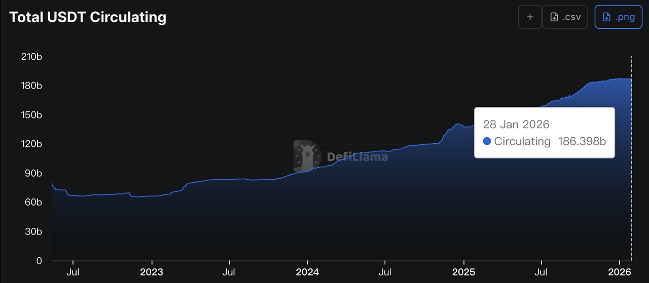 Em 2026, a capitalização de mercado do USDT já ultrapassou US$ 186 bilhões | Fonte: DefiLlama