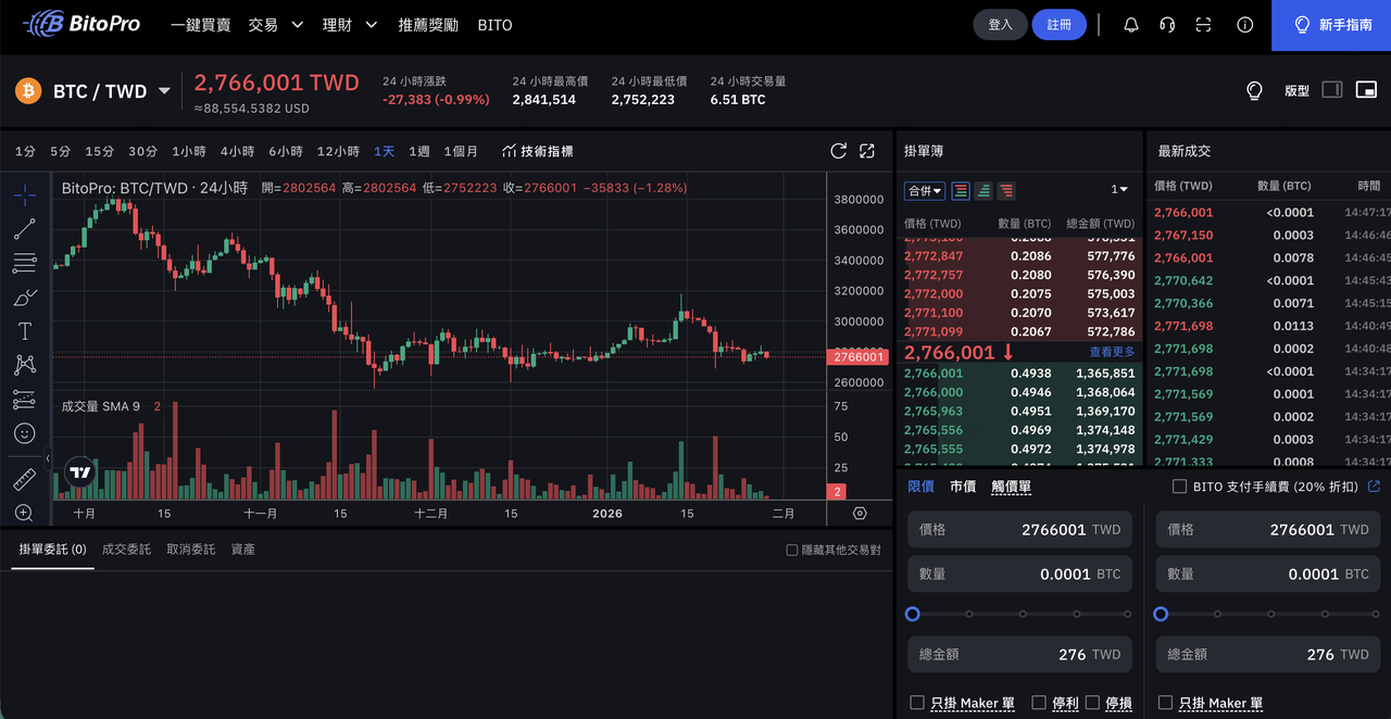 Em termos de compra de USDT e profundidade de negociação, BitoPro oferece par de negociação spot USDT/TWD, suportando colocação direta de ordens após transferência bancária e depósito em loja de conveniência. Como a base de usuários da plataforma e volume total de negociação são relativamente concentrados no mercado local, a liquidez de USDT/TWD pode atender às necessidades diárias na faixa de valores gerais, mas em negociações de valor relativamente grande, o preço real de execução pode ser afetado pela profundidade do mercado, aparecendo slippage ou expansão do spread de compra e venda. As taxas de negociação ficam aproximadamente na faixa de cerca de 0,1% para Maker e cerca de 0,2% para Taker, pertencendo ao nível comum de exchanges locais; se usar depósito em loja de conveniência, é preciso atentar para custo adicional de cerca de 1% de taxa de serviço.