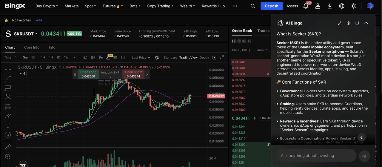Solana, e roteamento claro de carteira, a BingX torna fácil mover SKR da sua Seed Vault Wallet e começar a negociar em minutos. A plataforma também integra ferramentas da