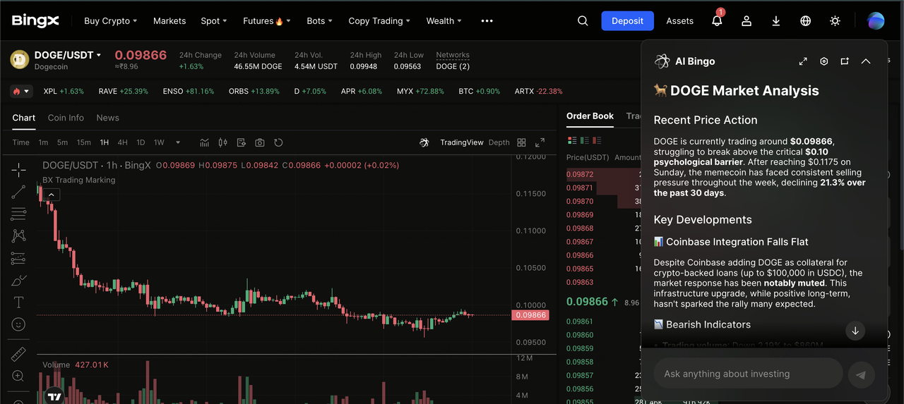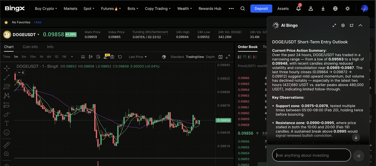 BingX AI para analisar tendências históricas e níveis de suporte, então coloque uma ordem de Mercado ou Limite para acumular DOGE.
