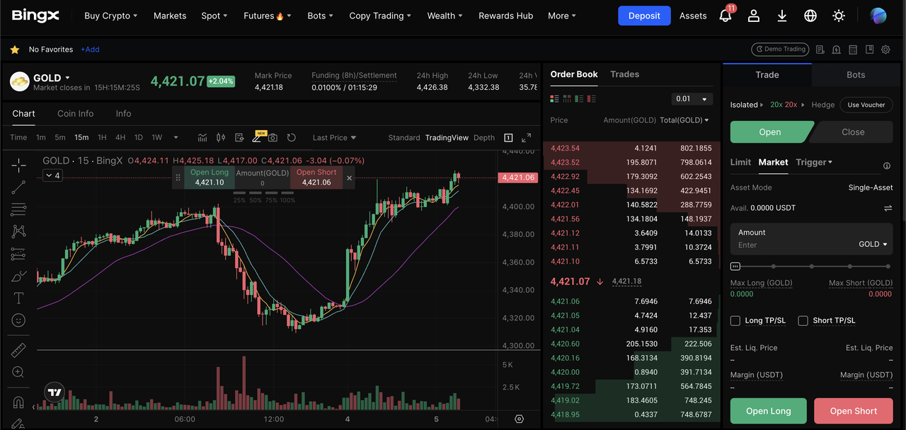 A BingX também suporta futuros de ouro liquidados em cripto, permitindo que os traders expressem suas visões sobre os preços do ouro usando garantia cripto em vez de fiduciária, uma configuração bem adequada para portfólios nativos de cripto.