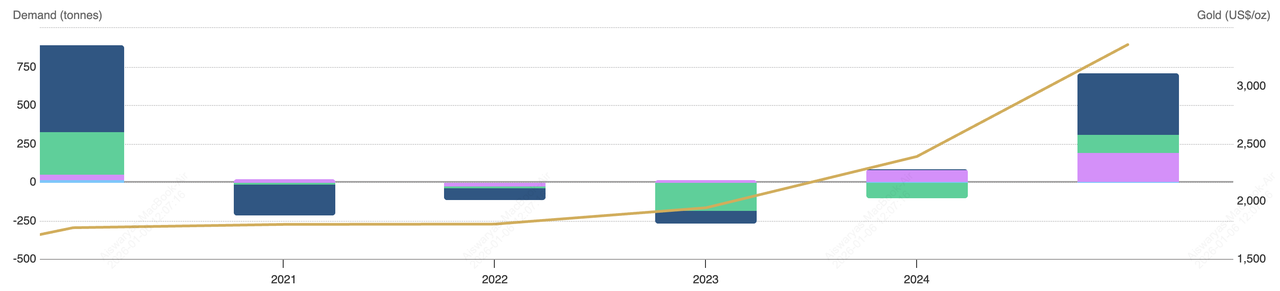 De uma perspectiva de estrutura de mercado, os ETFs tornaram-se um impulsionador dominante da demanda por investimento em ouro. De acordo com o World Gold Council, os ETFs de ouro globais registraram aproximadamente US$ 77 bilhões em entradas em 2025, adicionando mais de 700 toneladas de ouro às suas participações, uma das fases de acumulação de ETF mais fortes já registradas.