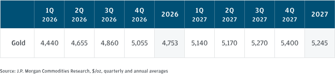 Previsões de preço do ouro pelo JP Morgan | Fonte: JP Morgan