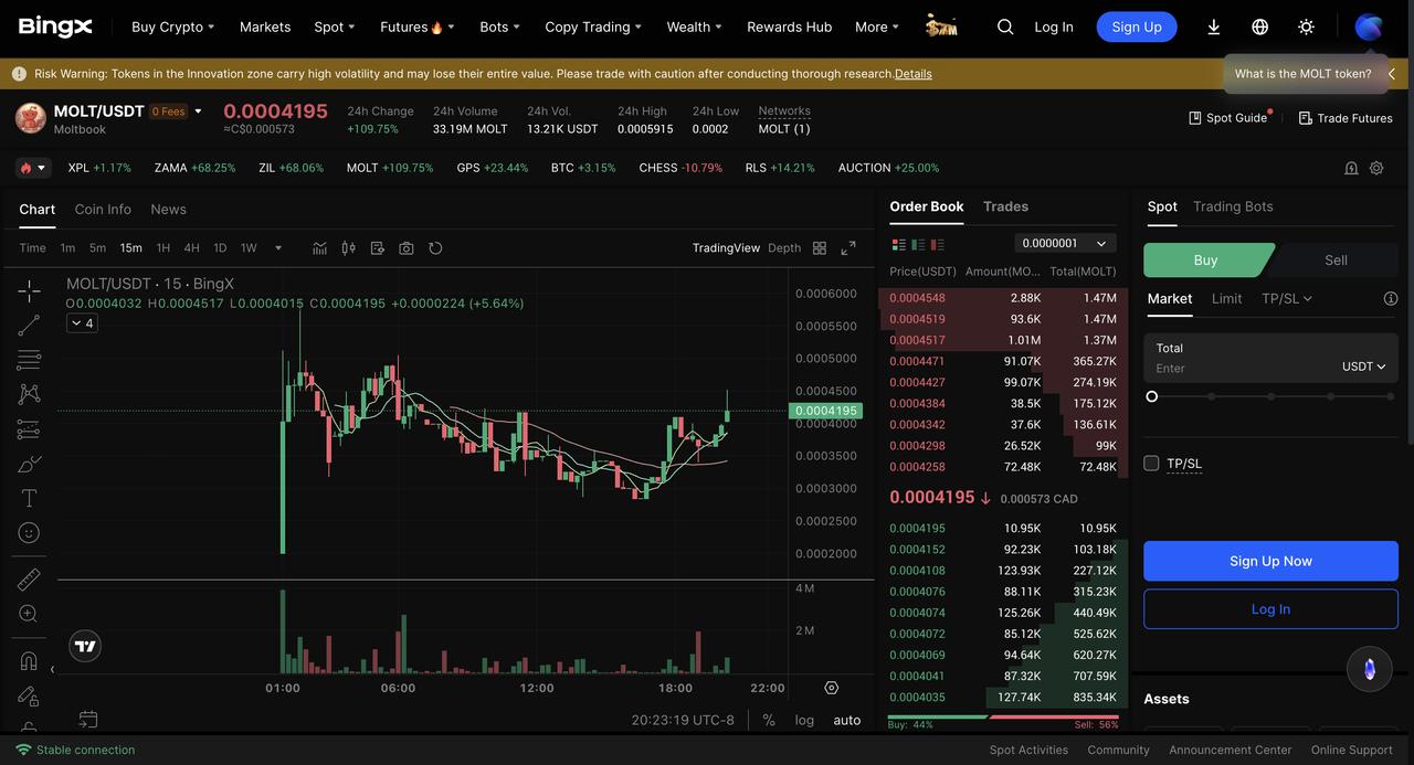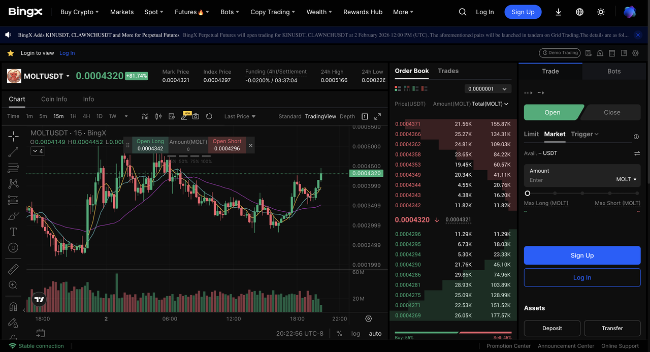 A BingX, uma exchange centralizada amigável ao usuário, suporta trading de MOLT com pares como MOLT/USDT e oferece ferramentas para compras eficientes. Em meio ao hype, o token já está listado em principais exchanges centralizadas, incluindo a BingX, onde os usuários podem negociar