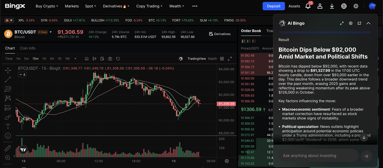 Perechea de tranzacționare BTC/USDT pe piața spot alimentată de insights-urile AI BingX