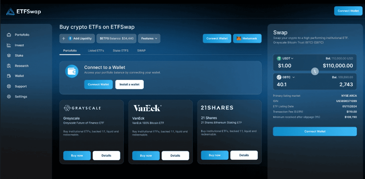 Aceste caracteristici sunt concepute pentru a face ca ETFSwap să se simtă ca un hibrid între o platformă de brokeraj ETF și un protocol de randament DeFi.