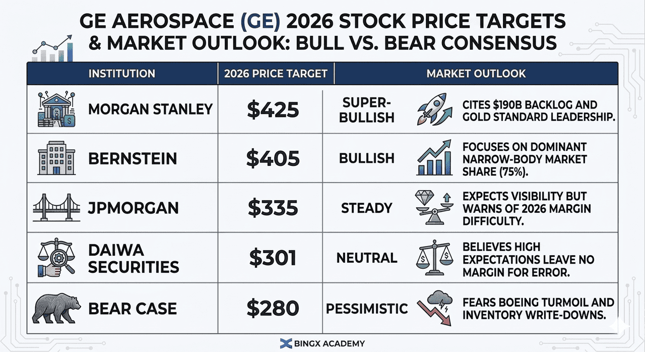 Несмотря на недавний откат, фундаментальная модель "бритва и лезвие" остается предметом зависти промышленного мира. Поскольку GE питает приблизительно 75% узкофюзеляжных самолетов мира через совместное предприятие CFM International, компания фактически является пунктом взимания платы за глобальные авиаперелеты. Это руководство разбирает прогноз цены акций GE Aerospace на 2026 год, используя данные от JPMorgan, Morgan Stanley и Wells Fargo.